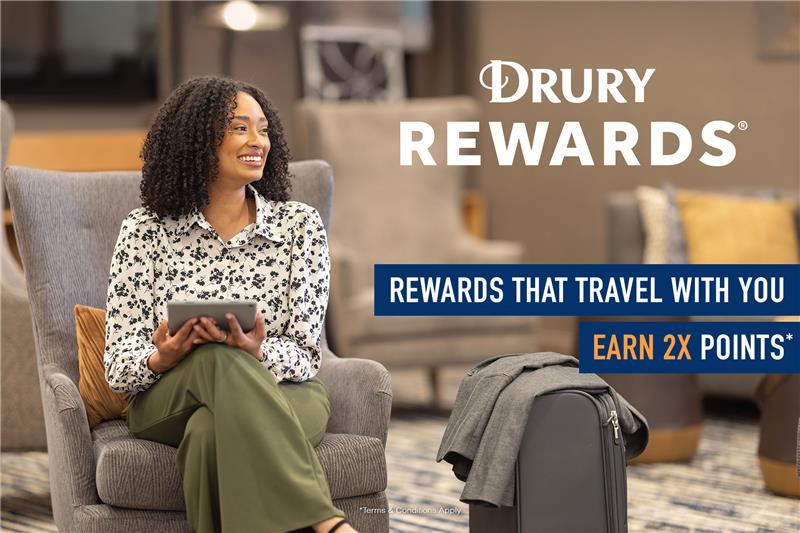 Traveling should feel rewarding. Join Drury Rewards® for FREE, and enjoy exclusive member-only rates when booking online or on our app. Plus, redeem points for free nights, gift cards, and more! Booking travel for others? Learn more and apply for Drury Rewards Business.